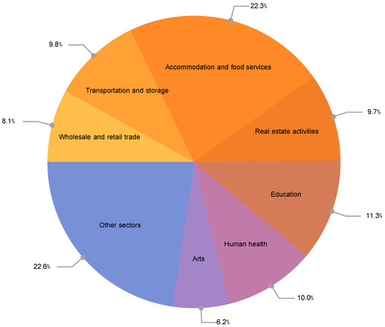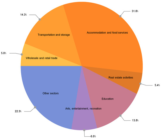 From Figure 5, it follows that 73.4% of the losses in domestic output of the US economy correspond to “Accommodation and food services” (22.3%), “Education” (11.3%), “Human health” (10.0%), “Transportation and storage” (9.8%), “Real estate services” (9.7%), “Wholesale and retail trade” (8.1%), and “Arts” (6.2%).