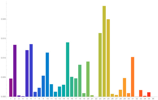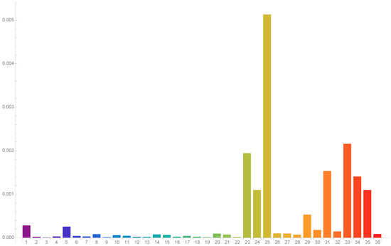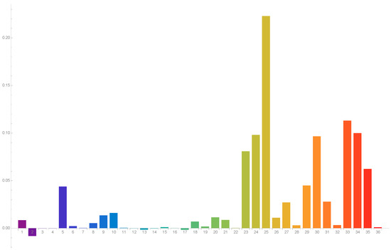 Now, to assess the multiplier effects of tourism receipts on the economic system we need to set the autonomous demand vector, , equal to the pattern of international travel receipts that corresponds to the 36 sectors classified in the IOTs of the US economy.3 Moreover, we divide all the elements of by the total tourism receipts of the economy and, therefore, it holds . The distribution of tourism receipts to the commodities of the different sectors of the US economy is represented in Figure 1: about 77.7% of the international travel receipts of the US economy are directed to the sectors “Accommodation and food services” (31.6%), “Transportation and storage” (14.3%), “Education” (13.8%), “Arts, entertainment, recreation and other service activities” (6.8%), “Wholesale and retail trade” (5.8%), and “Real estate activities” (5.4%), while about 22.3% of the travel receipts are directed to the rest of the 30 sectors.