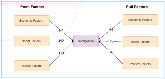 The regression analysis indicates that for the push factors, migration was positively and significantly influenced by push political factors (β = 0.128, p = 0.000), supporting Hypothesis 3 (H3). However, economic and social factors were found to have insignificant factors, which led to the rejection of H1 and H2. For the pull factors, migration in Romania was found to be influenced by economic factors (β = 0.137, p = 0.001), which led to confirmation of Hypothesis 4 (H4), and political factors (β = 0.612, p = 0.000), which led to confirmation of Hypothesis 6 (H6). However, social factors were found to have an insignificant effect on migration, which led to rejecting Hypothesis 5.