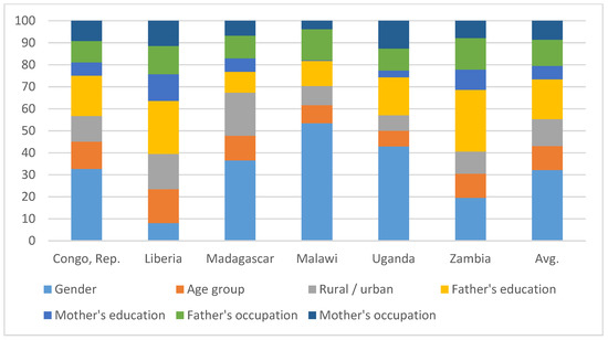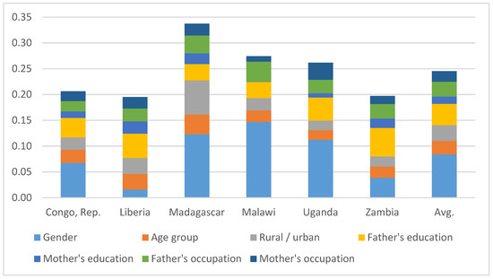 The dissimilarity index D summarizes the magnitude and distribution of inactivity gaps, and thus it quantifies more precisely the contribution of circumstances. From Figure 1, we see that youth inactivity dissimilarity is lowest in Congo, Liberia, and Zambia, where the index is around 0.20. Inactivity differences are on the other hand much more pronounced in Madagascar, where the index reaches 0.34. Malawi and Uganda are in between with moderate levels of dissimilarity of inactivity (0.26–0.27). The dissimilarity index of inactivity is much higher than for employment (Awad and Hussain 2021).