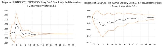 The results of the Augmented Dickey–Fuller test are presented in Table 3. As can be seen from the table, in the case of selected variables the hypothesis of the presence of a unit root can be rejected, i.e., variables are stationary and can be used in further analysis. Two variables (VIXt and NCSPt) appeared to be not stationary in level; thus, in further research, they are used in differences.
