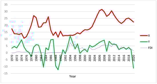 The data for the variables were obtained through the world development indicators compiled by The World Bank (2022) as time series of annual frequency for the period 1970–2020 in Peru. The sample size is equal to 51. During the analysis period, the mean value of the annual GDP growth rate was 3.03610%, and the mean values of the shares of exports and FDI flow to GDP were 19.44197% and 2.24495%, respectively. Time series , , and presented relatively low standard deviations: 5.24505, 6.08940, and 2.21435; thus, it was not necessary to transform them into natural logarithms to reduce their dispersion. Finally, Table 2 depicts a weak positive correlation between and , between and , and between and ; however, stands out as it is more correlated with .