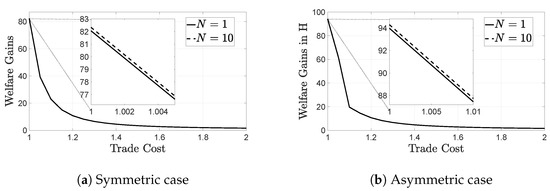 Figure 6. Welfare gains from trade with a more developed partner are different in the presence of explicitly modeled large firms ( N = 2 ), than in their absence ( N = 0 ). Hence, gains from trade are systematically miscalculated in standard purely monopolistically competitive models that dismiss the ability of large firms to influence market aggregates.