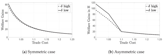 Figure 3. Trade generates welfare gains that increase with incremental trade liberalization and are maximized when trade is free at τ = 1 . When trading with a more financially developed partner (b), higher gains are created in comparison to the symmetric case (a), since the curve on (a) is below the one on (b) for any trade cost.