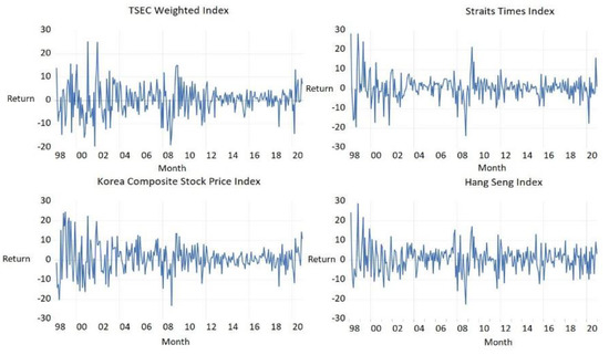 Our study is different from the study of Chen and Huang (2010) in the following aspects. Chen and Huang (2010) examined the return and volatility spillover between Canada, the UK, France, Germany, Hong Kong, and Japan and three emerging markets, Singapore, Korea and Taiwan, whereas our study examines the volatility as well as return spillover between Hong Kong, South Korea, Taiwan, and Singapore (the four Asian Dragons). More specifically, our study first examines the return as well as the volatility spillovers, whereas Chen and Huang (2010) examined both stock index and ETF returns. Second, our study examines the spillovers between the four Asian Dragons, whereas Chen and Huang (2010) examined the spillover and the leverage effects on returns and volatilities of both the stock index andthe ETF. Third, our study focuses on the Asian financial crisis (August 1997), the Global Financial Crisis (September 2008), and the COVID-19 outbreak (late December 2019), whereas Chen and Huang (2010) examined the spillovers using daily data. Fourth, our study uses the GARCH–ARMA model, whereas Chen and Huang (2010) employed the GARCH–ARMA and EGARCH–ARMA models. Finally, our full data sample is monthly data from August 1997 to December 2020, whereas Chen and Huang (2010) used a sample period from 14 January 2000 to 19 June 2019. Apart from these differences, the study of Chen and Huang (2010) is very beneficial for understanding the return and volatility spillover among the stock markets of the four Asian Dragons.