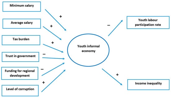 Berdiev and Saunoris (2019) report that the informal economy is one of the main drivers of income inequality. It can be easily explained: it is an obvious fact that persons involved in informal economic activities are not officially declaring at least a part of their income. The more person is engaged in informal economic activities, the higher is discrepancy between his/her official and real income (Huynh and Nguyen 2020b). If the informal economy involves a significant share of a population, it starts to be reflected in an increasing official income inequality within the country (Chen et al. 2020). We believe this is also true with the youth, so we formulated our last hypothesis (Indicator 2):