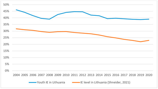 The level of the youth informal economy in Lithuania in 2004–2020.
