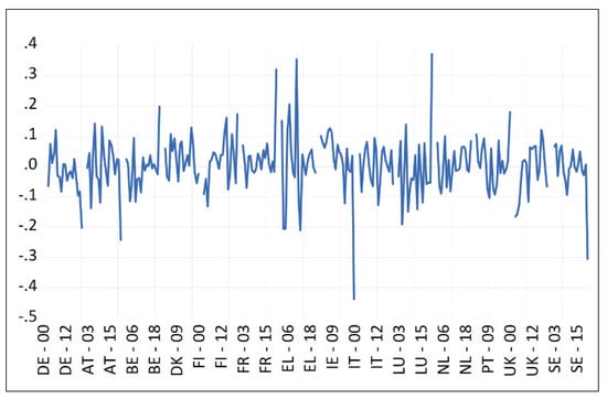 where refers to the it-th observation of the endogenous variable, refers to the it-th observation in the k explanatory variables considered exogenous and signifies the specific unobservable effects on the cross-sectional units in the long term. The variable outlines the idiosyncratic disturbance term that must satisfy the usual basic assumptions in a regression model. The short-term parameters are represented by and the long-term parameters by . The so-called one-period lagged long-term error, also known as the cointegrating vector, is enclosed in square brackets. Finally, the parameter α measures the speed of the correction between the short-term level of the endogenous variable and the level that the endogenous variable should reach in the long term. There would be no possibility of a cointegration or long-term relationship between the variables involved if this parameter was not significant (Hill et al. 2018).