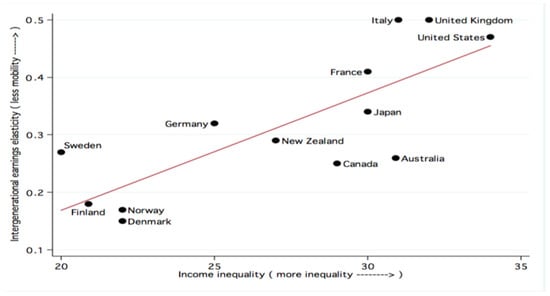 This Figure shows a cross-country positive relationship between generational earning elasticity and income inequality. The higher the elasticity, the lower the mobility, and vice versa. This Figure incorporates the data from several countries at a single point in time to exhibit the relationship between inequality and intergenerational social mobility. The Gini coefficient is used to measure income inequality, while the intergenerational earnings elasticity is used to measure how much children’s future earnings depend on the earnings of their parents. Higher levels of income inequality are shown to be positively correlated with reductions in intergenerational social mobility. However, it is not clear whether or not inequality causes these reductions in social mobility since there might be many other important factors that vary between countries that might be able to explain this relationship.