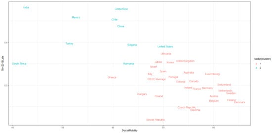 These findings are meaningless if we do not isolate countries with a similar lower/higher social mobility so that appropriate policy recommendations can be made at the national level. To achieve this, we make use of the K-means cluster analysis technique. This analysis is crucial in ascertaining whether income mobility is much lower in developing countries than in high-income countries. Figure 3 below exhibits the classification results using the K-means clustering. The x-axis represents the first principal component while the y-axis represents the second principal component of the social mobility dataset.