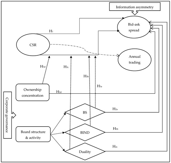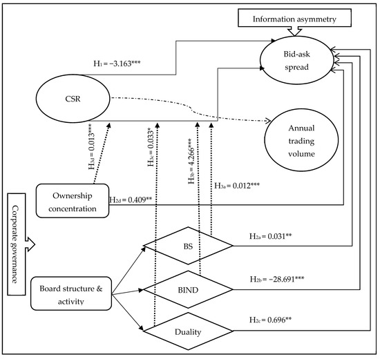 In Figure 2, we can notice that CSR disclosure reduces the information asymmetry between companies and investors. Furthermore, the results of the study suggest that several aspects of CG play a moderating role when it comes to the relationship between CSR and information asymmetry. More specifically, board size and CEO duality, as well as board independence positively affect the bid–ask spread. CSR disclosure and information asymmetry are positively influenced by moderation via board independence.