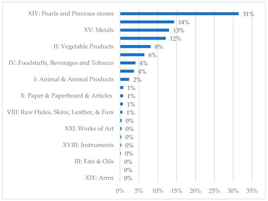 A focus at sectoral levels reveals that the SADC EPA countries are strong in the exports of diamonds in South Africa, Botswana, Lesotho, and Namibia, the share of the EU in Sector XIV (Pearl and Precious Stones) is around 31 percent (see Figure 2). The share of EU imports in Sector XVII (Transport) and Sector XVI (Machineries), respectively equal to 14 and 6 percent, are essentially from South Africa. Other products from the SADC EPA region are included in Sectors XV (Metals), V (Mineral Products), and are from Mozambique, Namibia, and South Africa. Agricultural products (Sectors I–IV) are from Botswana, Mozambique, Namibia, South Africa, and Eswatini, which mainly exports sugar.