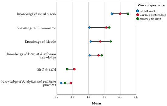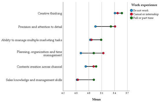 In light of the results of the research, the authors consider young employees’ skills perception of relevance when it comes to e-commerce employability skills. The results of employees and future employees’ survey support the findings of the expert managerial literature. We were able to ascertain the most relevant skill category, which is core marketing skills followed by digital and technical skills. We were able to convey the perceived importance of soft skills, since it increases for those already in the labor market. Moreover, within the top five skills (see Appendix B, Figure A2), four soft skills appear, such as creative thinking, motivation, problem solving, and precision. The former results of a content analysis of job advertisements also showed the importance of these skills (). Similar conclusions were described in the work of (), who found that there are differences by gender, age, and previous work experience for young people in terms of which soft skills they consider important.