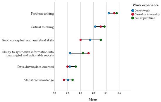 The analytical skills group consists of data-driven/data-oriented, good conceptual and analytical skills, statistical knowledge, problem solving, critical thinking, and ability to synthesize information into meaningful and actionable reports. Problem solving proved to be of the highest perceived importance from the employee point of view, and the agreement across segments was also high. Critical thinking and good conceptual and analytical skills had a higher appreciation in the two segments with work experience. The greatest differences between the means of the segments were in the case of good conceptual and analytical skills, and the ability to synthesize information into meaningful and actionable reports (Table 6 and Figure 5).