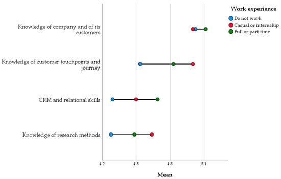 In the skill group of customer insights skills, knowledge of company and its customers, Knowledge of research methods, knowledge of customer touchpoints and journey, and CRM and relational skills were examined. The following table summarizes the perceptions of young employees regarding the perceived importance of their customer insights skills based on their work experience. This was the skill group where an evaluation of how young employees rate the perceived importance of their customer insights skills based on their work experience differed to a large extent. The highest agreement was observable in the knowledge of the company and its customers’ insights skills. Knowledge of CRM and research methods were considered less important, and the responses were diverse between the segments (Table 7 and Figure 6).
