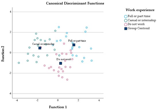 Canonical discriminant functions and group centroids of the three work experience segments.