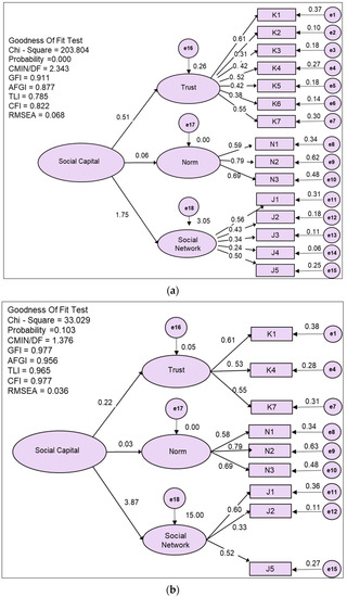 The Bangelan Village SEM analysis consisted of two stages to be able to describe the model that describes the social capital of the Bangelan Village community with the pandemic data. Stage 1 of the Bangelan village SEM model was carried out by entering all variables and indicators of social capital into the model and calculating the factor loading value. At this stage of analysis, indicators that had a value of 0.5 were discarded. The factors that were eliminated in stage 1 were the indicators K5, K7, J4, and J5 (Figure 5a). Then, a second test was carried out by recalculating the variables and indicators of the results of the first stage. Therefore, the second stage of the SEM test of social capital was formed from the indicators K1, K2, K3, K4, K6, N1, N2, N3, J1, J2, and J3 (Figure 5b). The results of the second stage of SEM social capital were the final stage because all indicators had met the requirements and the indicators were able to form the social capital of the village community.