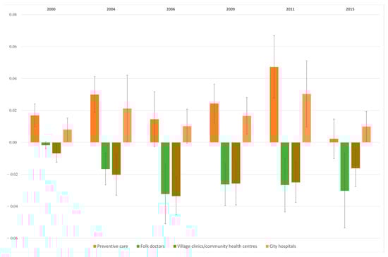 Significant values of the inequality indices are found for the health categories preventive care, folk doctors, village clinics/community health centres, and city hospitals. For clarity we represent the values in Figure 1 and Figure 2, respectively for rank-dependent indices and level-dependent indices. In terms of health facility use, the direction of inequality varies by provider levels where pro-poor inequality is observed for the use of village clinics/community health centres and pro-rich inequality for the use of city hospitals. Wealthier people seem to have better access to high-level hospitals that offer more sophisticated care and require higher OOP expenditures.