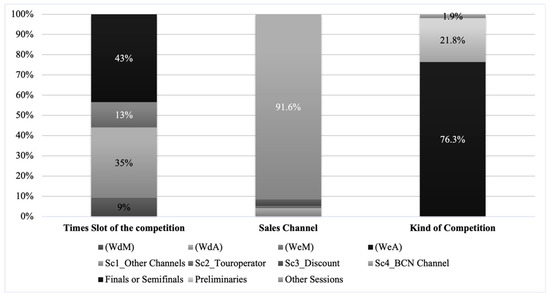Figure 1, Figure 2 and Figure 3 provide a summary of percentages for categorical variables examined in the current study. Figure 1 describes which types of competitions were the most “bought” depending on the time slot (during the week or weekends: WeA = 43%; WdA = 35%) and the type of the competition (finals or semi-finals = 76.3%, preliminaries = 21.8%, or others = 1.9%). It also shows by which of the online channels the largest number of purchase transactions took place (BCN Channel = 91.6%).