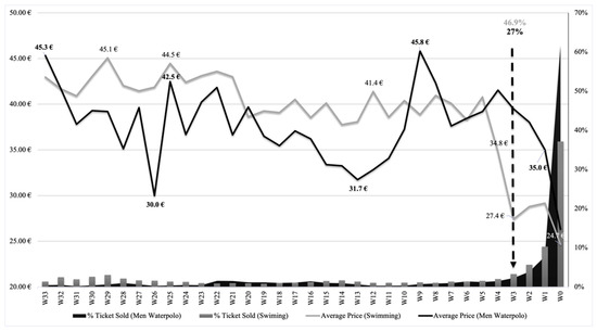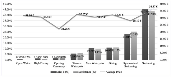 Figure 2 presents an overview of the sales distribution by discipline (related to the total sales in EUR), the relative assistance (%), and the average price for each sport discipline. Swimming, as the main competition occurring during the second week of the event, accumulated 45.72% of the total sales and 43.5% of the total assistance, followed by synchronised swimming with 23.04% and 25.35%, respectively. It can be also seen how four events out of the eight analysed (swimming, synchronised swimming, diving, and men’s water polo) accumulated up to 90.51% of the total sales and up to 93.7% of the total assistance to the event.