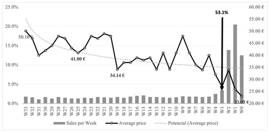 Figure 3 shows the sales and average price evolution for the weeks prior to the competition (from week 33 to week 1). It can be seen that as the date of the competition drew closer, more tickets were bought; however, it is important to note that just one day before the event started, only 53.1% of the total sales had been reached. On the other hand, it can be observed that, in general, prices dropped from the beginning until the last week of competition, with some pricing peaks (ups and downs) during the selling process.