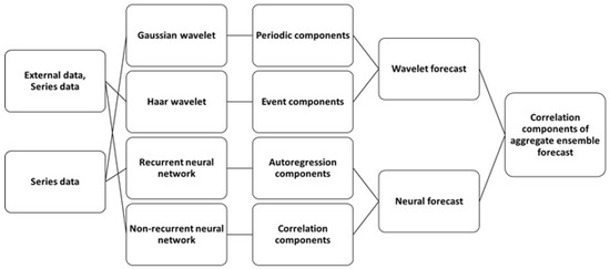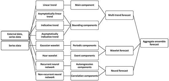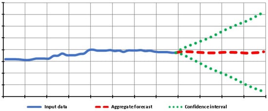 In general, the ensemble (aggregate) forecast model can be represented as the sum of the results of various forecasting methods, considering the individual degree of significance of each method (confidence coefficient) and the unexplained white noise that forms a random walk, according to Equation (7)