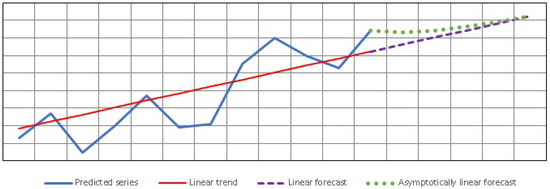 An asymptotic linear forecast is formed as gradually approaching a linear one. In this case, the negative coefficient of the indicative function is set so that the deviation from the linear trend at the point of the 85% prediction interval does not exceed 1%, and at the level of 100%, it is no higher than 0.5%, which corresponds to the value . The values of the linear forecast are used as upper or lower bounds. The asymptotic linear forecast of the asset value is formed according to Equation (9) and is presented in Figure 5.