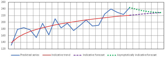 The asymptotic indicative forecast is formed in the same way as the asymptotic linear forecast, but the upper or lower bounds are given by the values of the indicative forecast, as shown in Equation (13) and is presented in Figure 6.