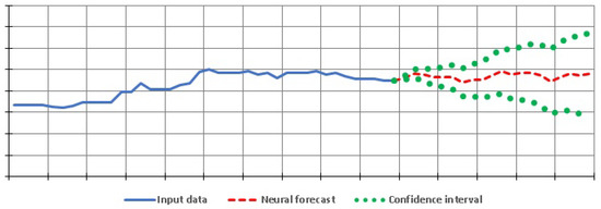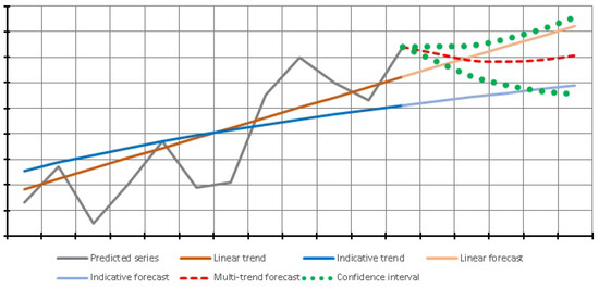 A multi-trend forecast is formed as an additive set of the above-mentioned forecasting methods, considering their significance weights (confidence coefficients), determined empirically for each forecasting method and for each time series. According to the additivity rules, the multi-trend forecast will correspond with Equation (14).
