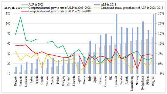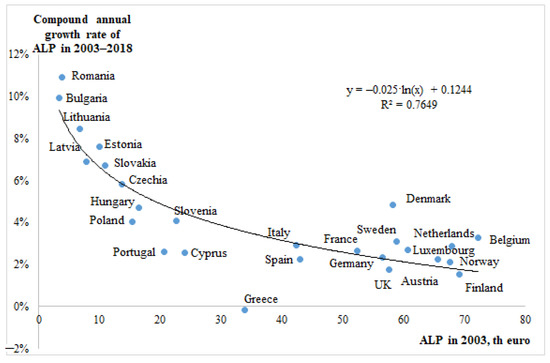 It can be seen that the growth of ALP recently is not so fast in less productive countries than it was 15 years ago. Thus, the problem arises that the gap between less and more productive countries will stop narrowing soon. The ALP growth rate in more productive countries did not change over 15 years and usually varied in the interval of 0–5 percent per year. It leads to the conclusion that the higher the ALP, the lower the growth of ALP is expected in the future. The relationship between ALP and its growth rate can be defined by the logarithmic function (Figure 2). As ALP in less productive countries (Bulgaria, Romania, Lithuania, Latvia, Estonia, Slovakia, Slovenia, Czechia, Croatia, Hungary, Poland, Portugal, Cyprus, and Greece where ALP is lower than the average) reached 14–41 thousand euros in 2018, the future growth rate of ALP is expected to be 3–6 percent per year, which is not much higher than the expected growth rate of more productive countries (1–2 percent per year).