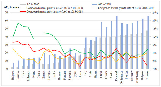 So, it is important to find ways to boost ALP especially in less productive countries. The possibility to boost ALP by increasing salaries is further tested. The average personnel costs (AC) ranged from 1.2 to 76.1 in 1995–2018 with a mean value of 27.7 and a median value of 24.1. AC is lower and its growth rate is higher in less productive countries compared to more productive countries (Figure 3). Thus, there can be suspected that AC is related with ALP, i.e., higher wages allow for an increase in apparent labour productivity.