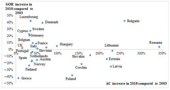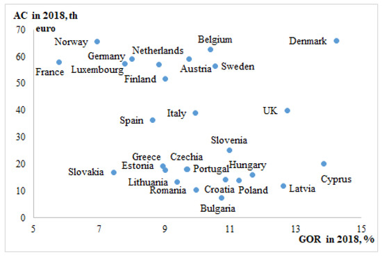 However, the growth of AC does not necessarily mean lower profitability. GOR in Bulgaria, Denmark, and Luxembourg has increased the most during 15 years, while GOR in Poland and Greece has decreased the most (Figure 4). Denmark and Cyprus were characterized by the highest GOR in 2018, while the GOR was the lowest in France (Figure 5).