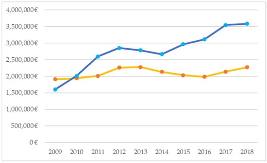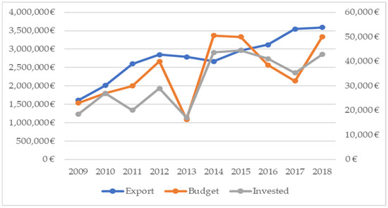 Figure 1 shows how the value of French bottled wine exports to third countries (blue line) displays a growing trend in the 2009–2018 period, with a 123% increase. However, although notable increases have also been registered for the budget and spending level during the period described (117% and 132%, respectively), strong ups and downs in the evolution are also observed.