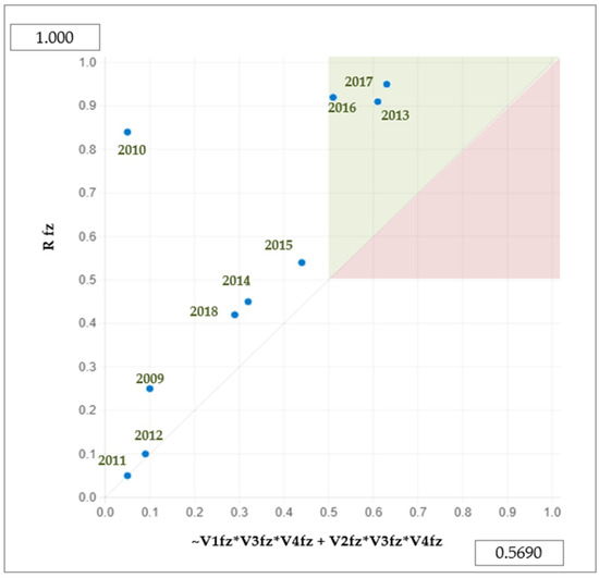 The following step is the selection of a limit of consistency to distinguish causal combinations that are sub-groups of the result of those which are not. In general, values below 0.80 in this column indicate substantial inconsistency. As a consistency threshold, 0.95 is chosen, and we assign the value 1 to the variable result (Rfz) when the consistency of this configuration passes the 0.95 threshold, establishing 0 otherwise.