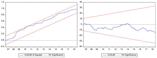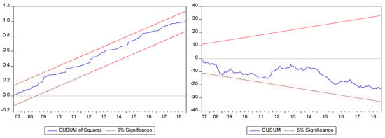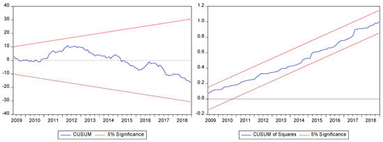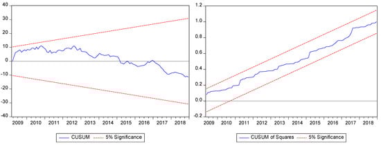 Finally, the study employed different diagnostic tests to check the non-linear ARDL model for autocorrelation, heteroskedasticity, normality issue of the residual and functional form of the model. These tests include the Breusch–Godfrey Serial Correlation LM Test, Breusch–Pagan Godfrey Heteroskedasticity Test, Jarque–Bera test for Normality Test and Ramsey Reset test for functional form of the model. The parameters stability was confirmed with the help of Cusum and Cusum of square tests.