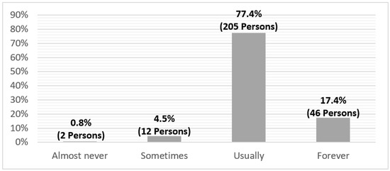 Particular emphasis is placed on the optimal use of environmental resources, which are fundamental elements of tourism development, while maintaining essential ecological processes and conserving natural resources and biological diversity (UNWTO 2021). A wide range of economic sectors have joined strategies to reduce climate change, and tourism is no stranger. Thus, strategies can be promoted that contribute to lowering the carbon footprint through the management of sustainable destinations and the construction of ecological tourist infrastructure (Urkullu 2015). In this regard, 73.2% of La Florida’s residents affirm that they always promote the social responsibility of tourists to protect natural attractions, while 9.4% do so regularly. Nonetheless, this leaves 17.4% with whom local governments must to work to achieve greater awareness (Table 4). Meanwhile, 78.5% claim to actively collaborate in programs, workshops, and training for the care and preservation of green areas, while 15.5% do so regularly. Similarly, 66.8% confirm that they always take into account the conservation of local resources. They also note a commitment from the local government, in which the municipality promotes action and awareness to maintain green areas in good condition.