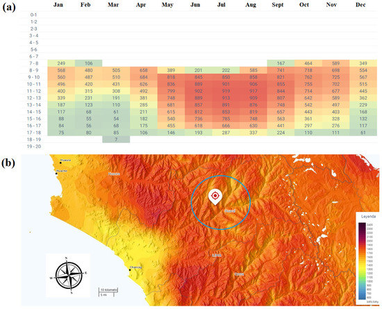 Because the town of La Florida is located within a rugged and mountainous geographical context, it has good conditions in terms of average hours of sunshine per day (9 h), from roughly 8:00 to 17:00, with the highest intensity being from May to September. Figure 2 presents the relevant values in a heat map, with red representing the maximum values reached and light blue the minimums.
