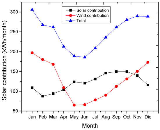 Figure 3 displays the monthly variation in energy contributions for each system installed in a lodging house. Note the greater degree of contribution of PV systems. When designing a hybrid system (solar—wind), it is necessary to adapt to meet energy demands. While an alternate scenario might consider a purely PV system, for a period of five months the solar irradiation is inadequate (Figure 3); therefore, a hybrid design is suggested.