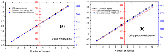 As discussed, the application of systems that meet energy demand through renewable sources can also help contribute to sustainability. Thus, Figure 4 displays a directly proportional relationship between the number of houses with such systems installed and sustainability measures such as reductions in CO2 emission, equivalence in trees planted per hectare, and annual economic savings (in USD). Figure 4a treats wind turbine systems while Figure 4b is for the PV systems.