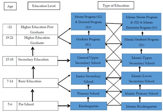 The Indonesian education system is regulated by the Law on the National Education System (No. 20/2003). The management of education in Indonesia is regulated by the Ministry of Education and Culture and the Ministry of Religious Affairs. The education system in Indonesia is further divided into three main types, namely formal, non-formal, and informal education (Hendajany et al. 2016). Formal education is education held in schools while non-formal and informal education occur outside the school system. In formal education, there are three levels: basic education (primary), intermediate education (secondary), and higher education (tertiary). Primary education consists of elementary school or madrasah ibtidaiah and junior high school or madrasah tsanawiyah. Secondary education consists of senior high school (madrasah aliyah) and vocational school (SMK). Figure 1 shows the illustration of the education system in Indonesia in accordance with Law No. 20 of 2003. The chart on the left shows the average age of individuals consistent with school level. The middle chart shows the level of education in Indonesia and the rightmost chart shows the types of formal schools in Indonesia.