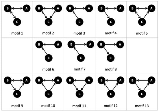 The nodes within a complex network are interconnected in various patterns. Network motifs are one of the most potent ways to explore microscopic structures in a complex network. Motifs are defined as small-connected sub-graph within a directed network (Milo et al. 2002). There are several motifs’ categories based on the number of nodes involved. The two-nodes sub-graph is named dyadic motif, while the three-nodes sub-graph is named triadic motif. The triadic motif contains richer microscopic structure types than the dyadic one (Vladimir and Selena 2016). It consists of 13 subgraph motif combinations which are shown in Figure 1.