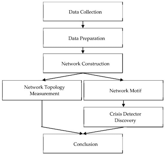 We designed the research workflow in several steps: data acquisition; data preparation; network construction; which were then divided into two substeps: first to measure the macro perspective as network topology measurement, and second, to measure the micro perspective as network motifs measurement; followed by finding a pattern as a crisis detector; and at last, research conclusions. We illustrate the research workflow in Figure 2.