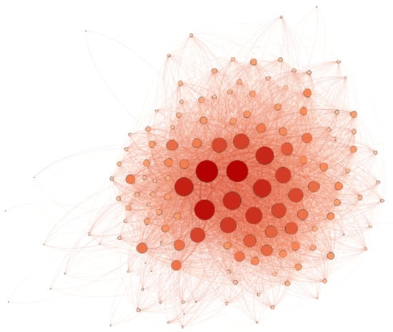 The research examines the transaction network structural changes for 18 months during the pre-crisis (October 2007 to December 2007), crisis (January 2008 to December 2008), and the post-crisis phase (January 2009 to March 2009). The overall 18 months transaction network is found to be a scale-free network. These findings align with those disclosed in Section 2, which shows that only a small part of nodes become highly influential actors. The real-world transaction networks consist of many less-connected banks, while only a small proportion of banks are connected to most other banks. This behavior is demonstrated with a power-law degree distribution, as visualized in Figure 3. We summarize that the bank’s contribution within the transaction network is not normally distributed but is distributed with a long tail. This reveals that each bank does not have the same contribution to the transaction network. Most of the transactions are contributed by only a few majority banks. The transaction network is visualized in Figure 4; the more well-connected or well-contributed banks are visualized in a darker and bigger circle.
