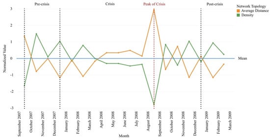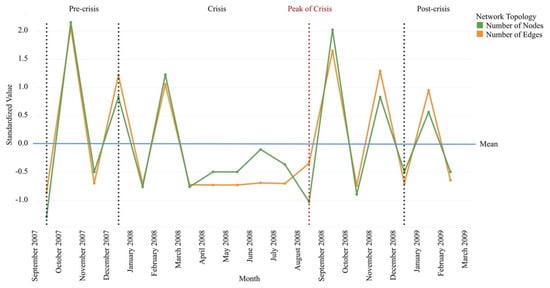 From the macro perspective, network structures were measured through the number of nodes, edges, average distance, and density. The number of nodes was used to measure the monthly transaction network size based on the number of banks involved in credit debit activities. The number of edges was measured to provide the total transaction activity between the banks for each period. Average distance measurement was carried out to determine the minimum average number of intermediary banks required to flow money from one bank to other banks. Finally, the network density indicated the density of transaction flows that occurred within these transaction networks. Each monthly measurement result was standardized to obtain a more relevant fluctuation comparison. Standardized measurement results are presented in the form of a time series plot showing the fluctuations better. We discover the macro network structural changes and their relationship to the empirical conditions during the crisis period through this plot.