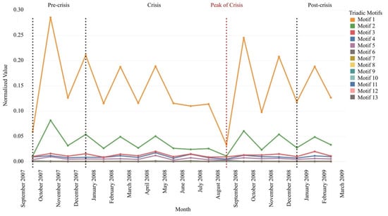 The network microscopic structural shift is explored by measuring the occurrence of each 13 triadic motifs. The normalized measurements result in a time-series plot, as shown in Figure 7. The measurement results underline that motif 1 and motif 2 dominate the microscopic structure of the transaction network. Motif 1 represents the structure of two reciprocal transactions between three banks, while motif 2 represents three reciprocal transactions between three banks. Or in other words, these two triadic motifs are formed by reciprocal relationships.