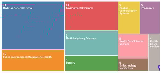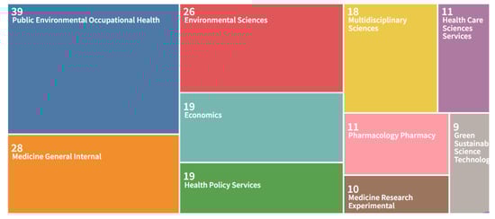 Searching for scientific studies focused simultaneously on COVID-19, healthcare institutions, and economic impact, we found 312 studies in total, published in the period 2020–2021 in scientific journals indexed on the Web of Science database (). Using the WoS tool Treemap () shows 10 results for scientific disciplines most connected with the keywords COVID-19, healthcare, and economy (Figure 1).