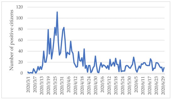 Increase in COVID-19 positive citizens in Prague in March–June 2020, daily data. Source: Own processing, based on the data (); ().