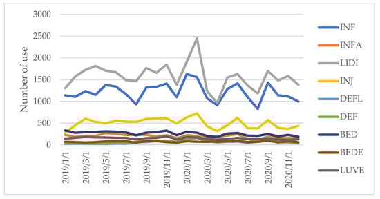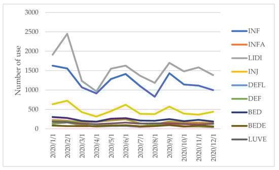 Based on the filtering of selected facilities, tables were compiled in which the use of selected types of facilities in a specified time range was compared. This step in the research aimed to determine the increase or decrease in the use of facilities in a particular hospital before and during the COVID-19 pandemic. For this purpose, the time interval from the end of August 2018 to March 2021 was selected. The obtained data were then processed in graphical form, which were then used for the further research purposes of this paper.
