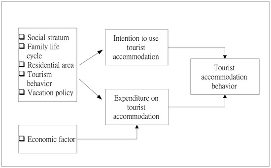 According to the two-stage decision model, the decision on the intention to use tourist accommodation and that of accommodation expenditure constitute the consumer behavior of tourist accommodation. Based on a summary of the previous literature on tourism expenditure (e.g., Dardis et al. 1981, 1994; Cai 1999; Nicolau and Màs 2005; Sun et al. 2015) and by considering the implementation of vacation policy, the variables influencing the intention to use and actual expenditure on tourist accommodation can be classified into six categories, namely, the economic factor, social stratum, geographical location, family life cycle, tourism behavior, and vacation policy. In this study, it is assumed that the economic factor influences the expenditure on tourist accommodation but does not influence the intention to use accommodation. This is mainly because if the same explanatory variable is included in the two sets of decision equations, it may be impossible to correctly identify the model’s parameters (Newman et al. 2001). Therefore, it is necessary to add certain exclusion restrictions (Jones 1992; Newman et al. 2001; Aristei et al. 2008) to facilitate the estimation of the parameters in the model equations. In terms of the empirical application, it is usually assumed that the participation equation is a function of noneconomic factors; thus, the economic factor can be excluded from this equation (Newman et al. 2001; Aristei et al. 2008). The research framework of this study is presented in Figure 1. The research hypotheses are presented as follows.