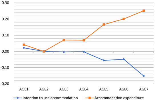 With respect to the family life cycle, females have a significantly higher intention to use tourist accommodation compared to males. The numbers of traveling companions between the ages of 0 and 6 (A06) and 7 and 11 (A711) have a significant positive impact on the intention to use tourist accommodation. In terms of the marital status variables, the married group (MAR2) has the highest intention to use tourist accommodation with a significant estimated coefficient; the unmarried group (MAR1) has the lowest intention to use tourist accommodation with an insignificant estimated coefficient. In terms of the age variables, the 12–19 age group (AGE1) has the highest intention to use tourist accommodation and the over 70 age group (AGE7) has the lowest intention to use tourist accommodation, with a coefficient that is significantly different from 0. As age increases, the intention to use tourist accommodation declines (Figure 2). With regard to the residential area, the eastern region (RE) is used as the benchmark, and among the four residential areas, only the variable coefficient for other regions (RO) reaches the significance level. From the perspective of the estimated coefficients, tourists residing in the southern region (RS) have the highest intention to use accommodation, and those residing in other regions have the lowest intention to use accommodation. The results provide proof for the argument of Jang and Ham (2009) and Bernini and Cracolici (2015) that the family life cycle, and in particular, having children in the household, is a determinant of the travel decision and, as a result, of the accommodation decision.